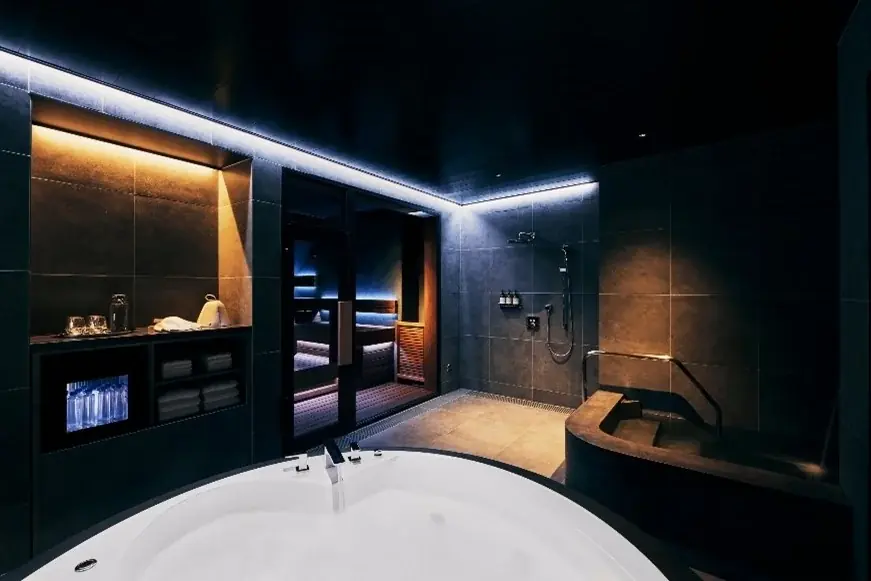 特に注目すべきは、全9室に設置されたサウナ付き客室です。フィンランドのMETOS社製のサウナストーブを使用し、静岡の「サウナしきじ」の笹野美紀恵氏がプロデュースしたサウナージュを完備。ガラス張りのサウナ室からは、富士山の美しい景色を楽しむことができ、本格的なサウナ体験が可能です。