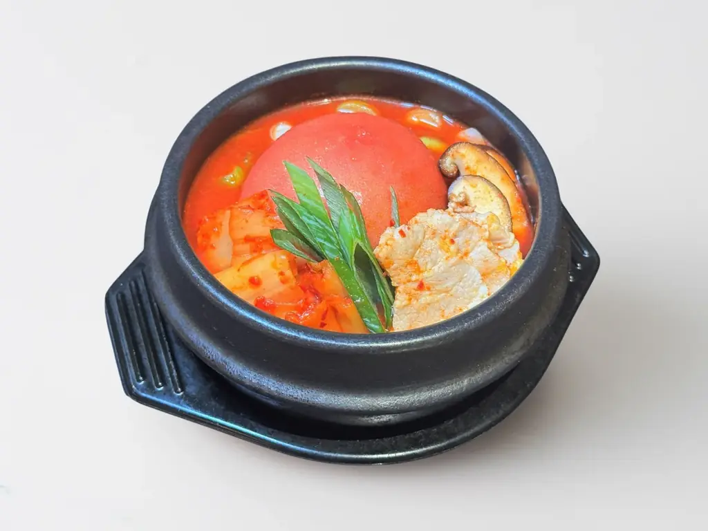 - 丸ごとトマトキムチチゲ – 1,630円(韓国料理ビビム): 熟成トマトを丸ごと使用したインパクトのあるキムチチゲ。