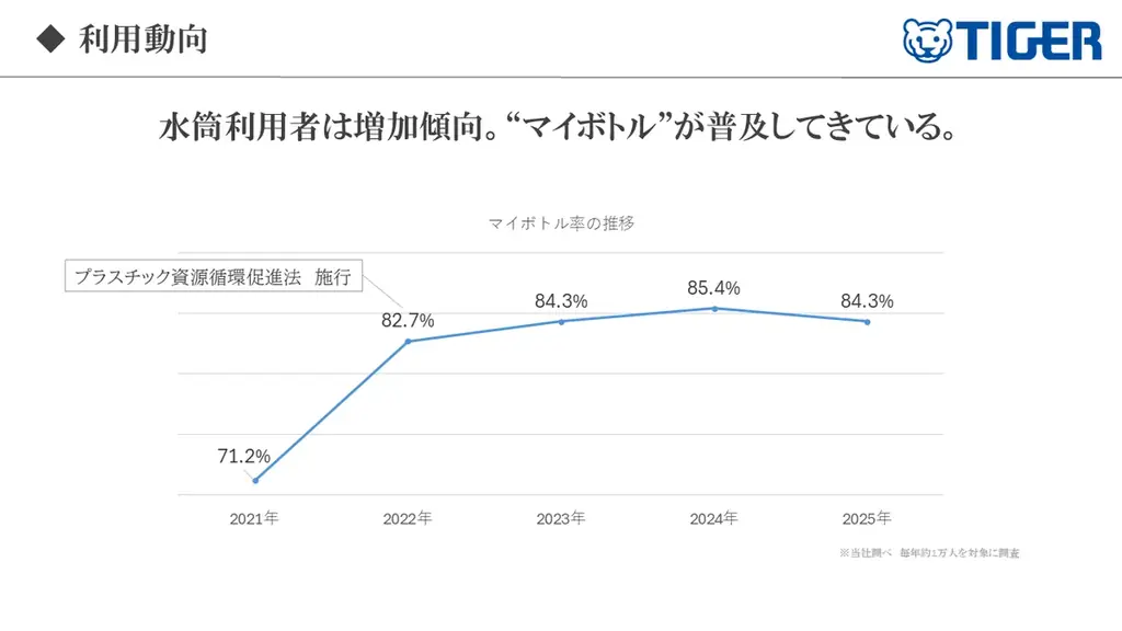 タイガー魔法瓶が実施した調査によると、マイボトルを日常的に使用している人は84.3%に達し、直近5年間で13.1ポイントの増加が見られています。この調査結果は、マイボトルが外出先だけでなく、室内や日常生活においても身近な存在となっていることを示しています。