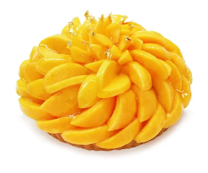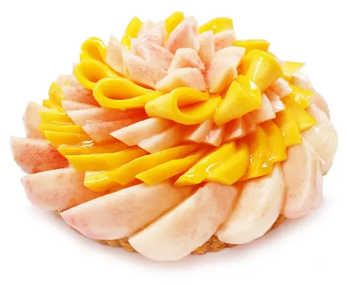 芳醇な香りとみずみずしさが特徴の黄金桃をふんだんに使用し、フロマージュブランのベースに飾り付けました。希少な黄金桃の美味しさを存分に堪能できます。 - 桃とマンゴーのケーキ