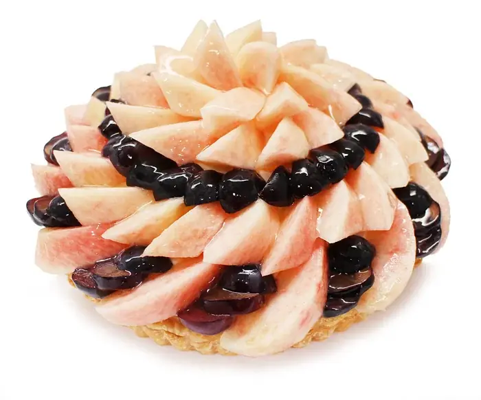 果汁たっぷりの桃と濃厚な甘みのぶどうを美しく飾り付け、コクのあるカスタードクリームのベースと共に楽しめる贅沢なケーキです。