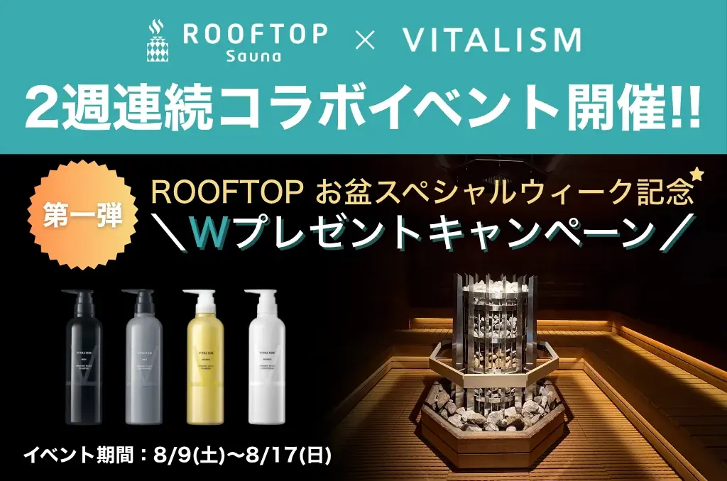 イベントの第一弾として、2025年8月9日(土)から8月17日(日)までの期間中、「お盆限定プレゼントキャンペーン」が実施されます。このキャンペーンでは、公式X(@rooftop_sauna)の対象投稿をリポストするか、期間中にROOFTOPを訪れた方を対象に、VITALISMのヘアケア製品や限定ノベルティがプレゼントされます。