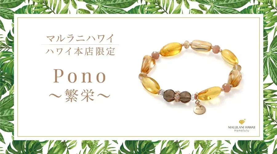 新作パワーストーンブレスレット「Pono~繁栄~」は、金運、健康、愛情運をサポートするために設計されたプレミアムなアイテムです。ハワイの自然のエネルギーを感じることができるこのブレスレットは、自分自身のためにも、大切な人への贈り物としても最適です。