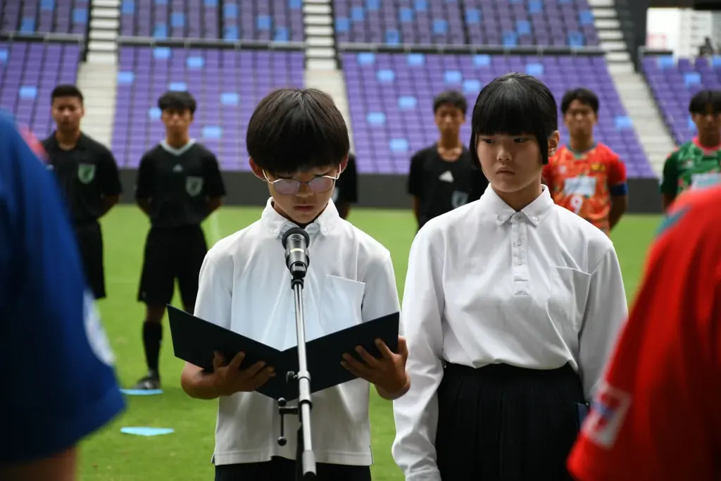 試合前のセレモニーでは、広島市立戸坂中学校の3年生である中尾さんが平和宣言を行いました。彼は「平和を守るためには、今私たちができることを考え、行動することが大切」と語り、次世代の平和への取り組みが重要であることを訴えました。
