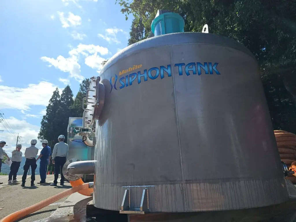 モバイルシフォンタンクMST-2300の搬入は8月6日に完了し、8月8日に濁度0.01度を達成、8月9日から日量1,000立方メートルの水道水供給を開始しました。供給は仮設浄水場として消雪用井戸を水源とし、地域の生活用水の安定化に寄与しています。