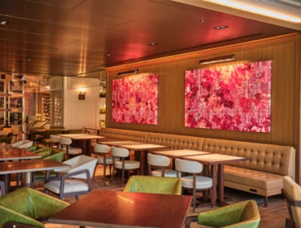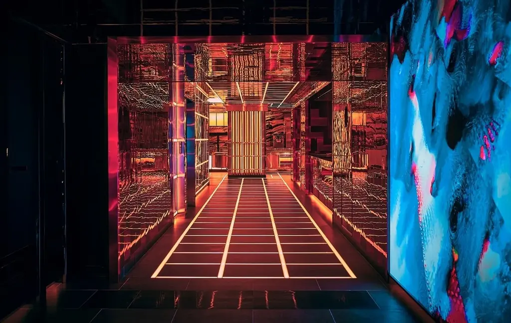 ライブキッチンへとつながる通路には「LEDアートウォール」が導入され、時間帯に応じて変化する映像と音楽が組み合わさった演出が施されます。映像は新宿の街並みや錦鯉をモチーフにしたもので、世界的なショーを手がけるクリエイティブチームによる制作です。