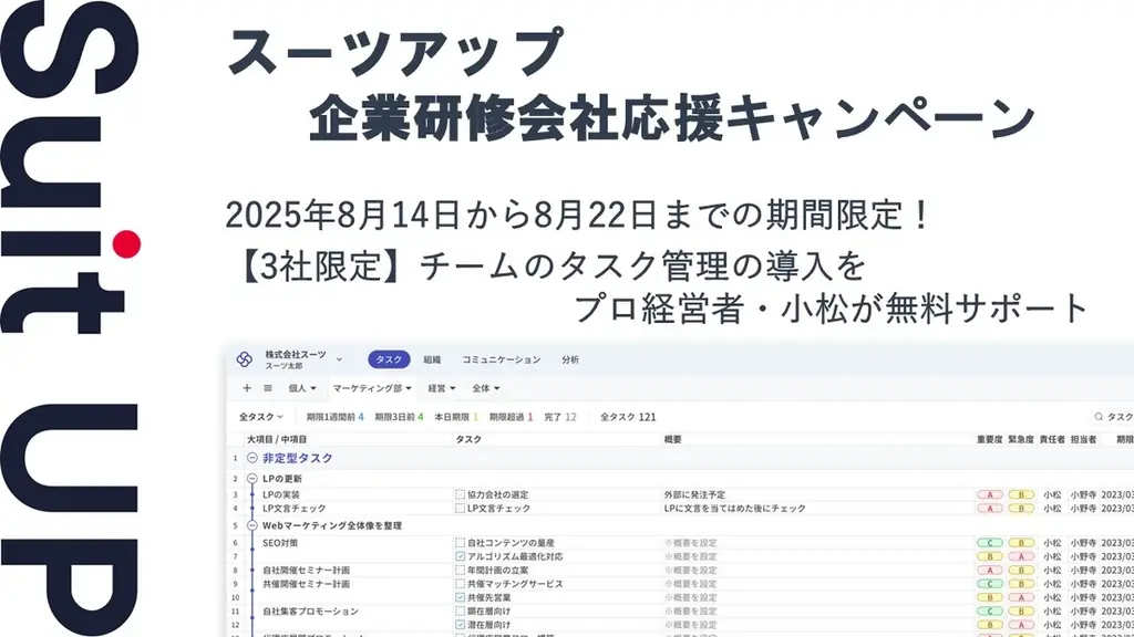 株式会社スーツ(代表取締役社長CEO:小松 裕介)は、チームのタスク管理・プロジェクト管理ツール「スーツアップ」に関し、企業研修会社を対象とした応援キャンペーンを実施します。本リリースは2025年8月14日 01時10分に発表されました。