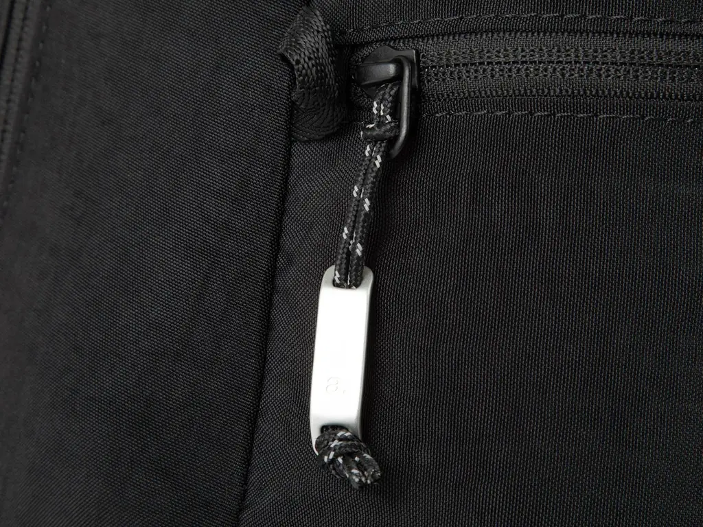本体素材にはワッシャー加工を施したナイロン生地を採用し、自然なシワ感とハリ感を表現している。さらにテフロン加工により撥水・撥油性を確保し、見た目の美しさと実用性を両立させた設計となっている。フロントポケットの引手には軽量なオリジナルアルミを採用し、デザイン上のアクセントにも配慮している。