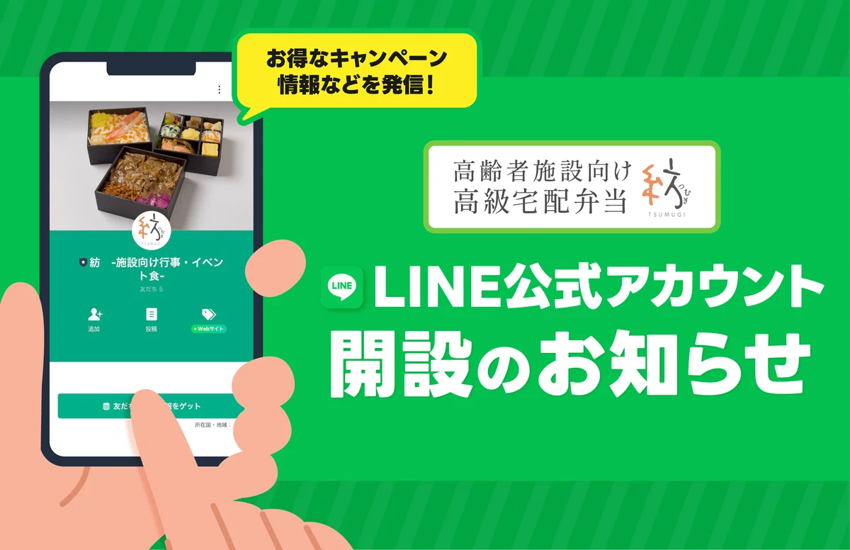 LINE公式アカウント | アカウント名:紡 -施設向け行事・イベント食- ID:@tsumugi2025 URL:https://lin.ee/9zd20Xc |