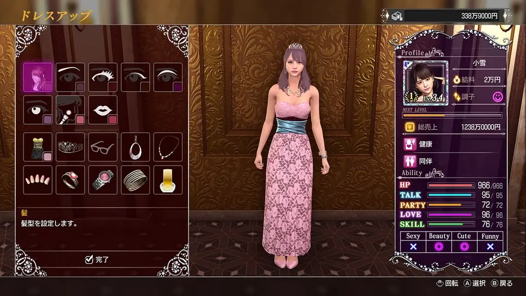 システム面では、客の好みに合わせたキャストアサインや、数十人に及ぶキャストの能力育成が重要となる。キャストが成長すると能力が上がり、客単価や満足度が向上するため、売上を伸ばして大会優勝を目指す戦略性が求められる。