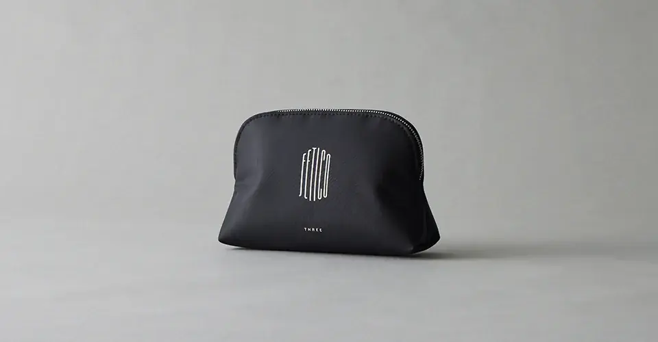 今回のコラボレーションを象徴するアイテムが、舟山瑛美氏デザインの限定メイクポーチです。製品名は「FETICO」×「THREE」by R Limited Edition Makeup Pouchで、光沢感のあるナイロンツイル生地を採用したクラシックなシェル型が特徴です。