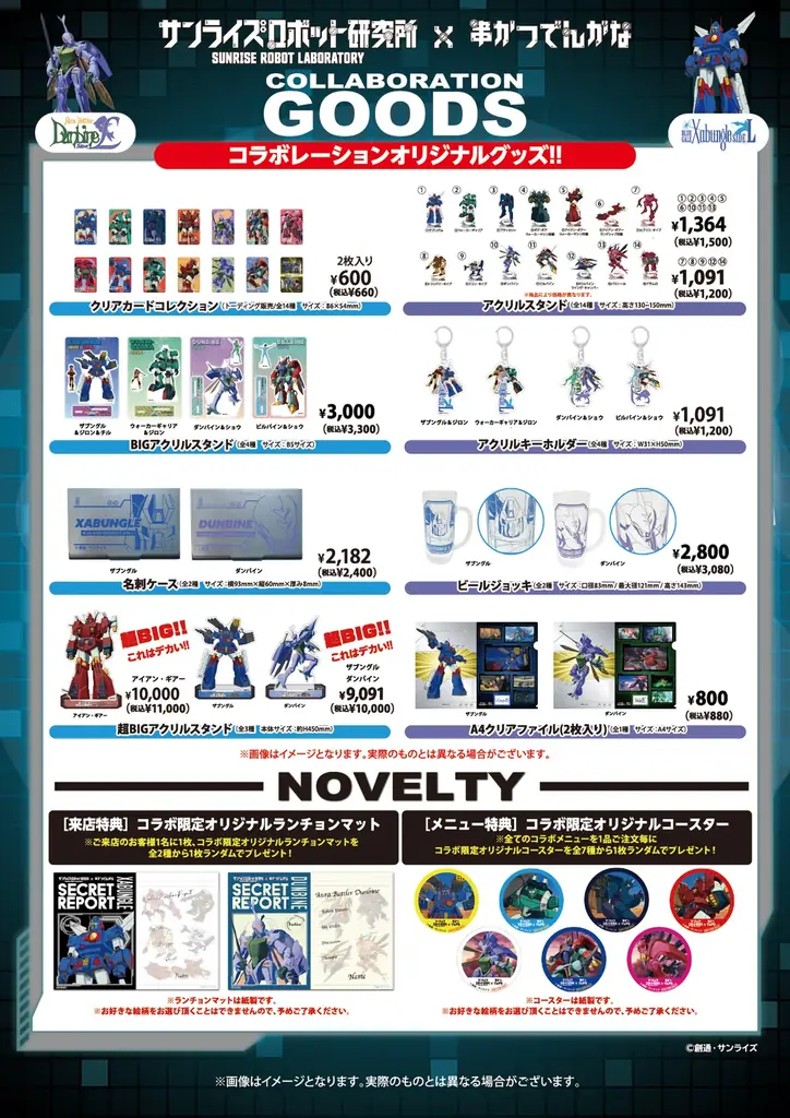 グッズ販売 | 初出しグッズ8種を販売(例:AURA BATTLER DUNBINE SIDE L/SIDE R、BLUE GALE XABUNGLE SIDE L)。グッズ購入はコラボメニュー注文者に限る。売切次第終了。不良品以外の返品不可。 |