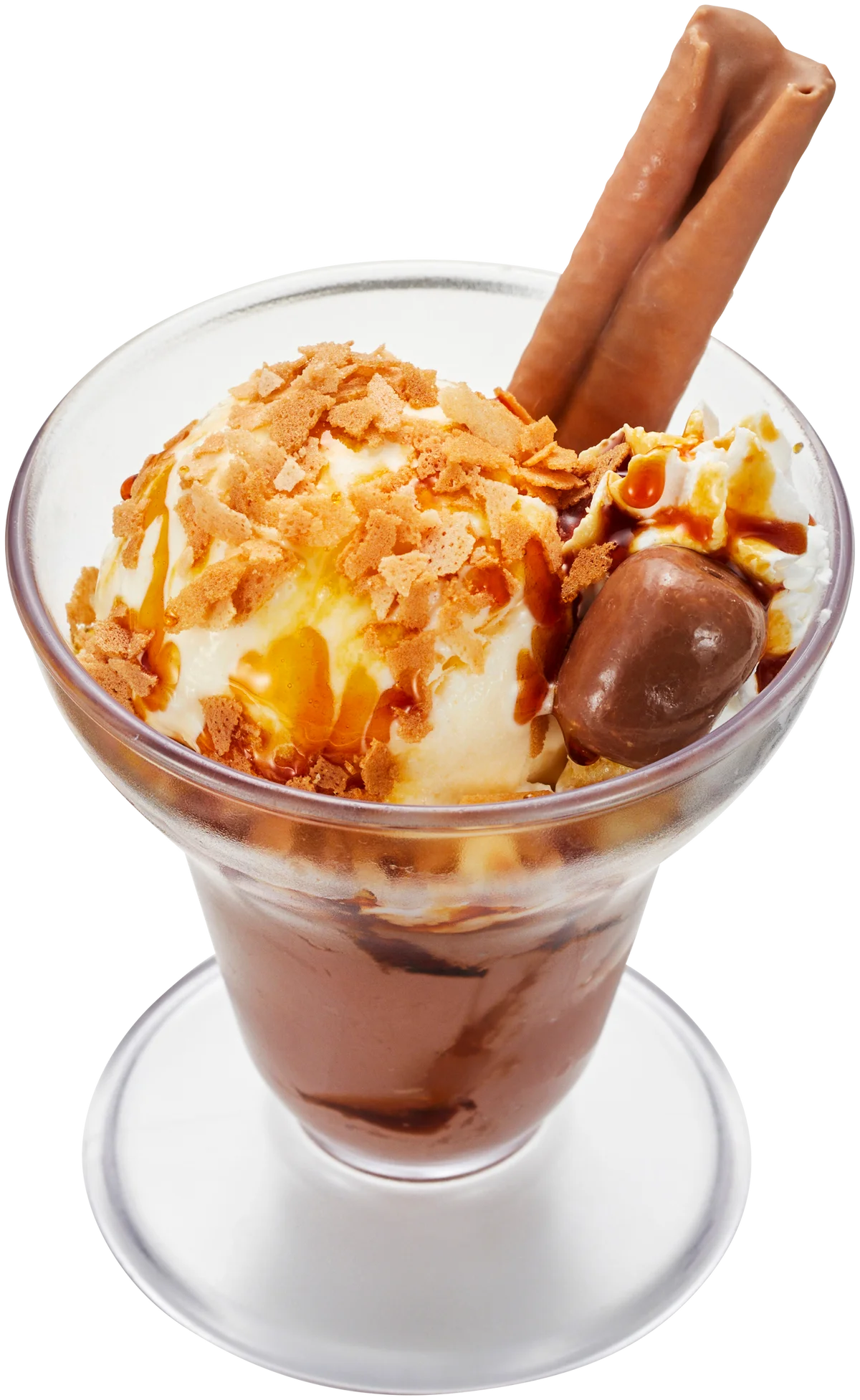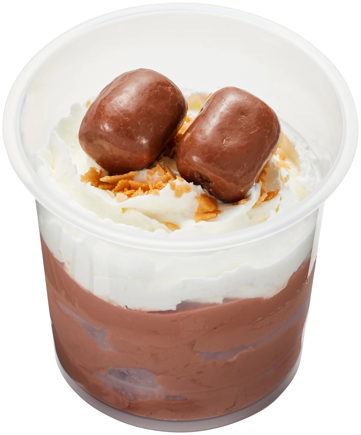 パフェはココアプリンを土台に、ロングセラーの「ルマンド」そのもの、ザクザク食感の「ひとくちルマンド」、なめらかな口当たりのチョコムースを層状に組み合わせた商品です。複数の食感と層ごとの味わいの変化を意識した監修デザートとして設計されています。