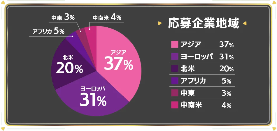 応募企業に関するデータは以下の通りです。国別比率はアジア37%、ヨーロッパ31%、北米20%であり、日本に限らず世界各地からの応募がありました。