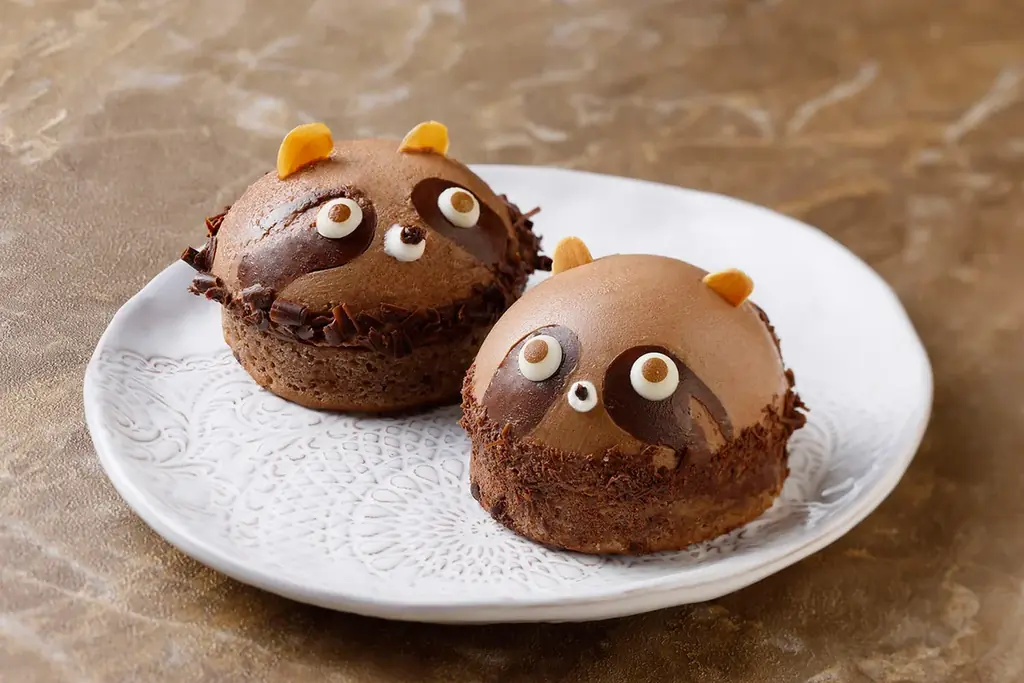 内部はガナッシュとチョコレートムースで構成され、そこにチェリーと木いちごの香りをまとわせたコンフィチュールを忍ばせることで、酸味と甘味のバランスをとっています。ホテルのパティシエが手作業で一つ一つ仕上げるため、たぬきの表情が微妙に異なるのが魅力です。集合イメージ写真はリリースで「たぬきケーキ集合イメージ」として示されていますが、実際の商品は一つずつ手作りのため個体差があります。