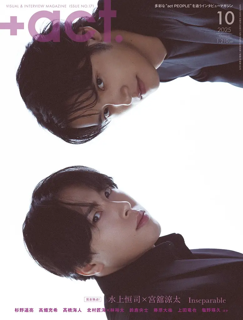 2025年10月号の『+act.(プラスアクト)』は、特集〈Inseparable〉の号であり、表紙巻頭を水上恒司と宮館涼太が飾る。誌面は完全独占の撮り下ろしと、ふたりによるロング対談で構成されている。撮影は韓国のカメラマンが担当し、モノクロームの世界観が際立つカットが多数収録されている。