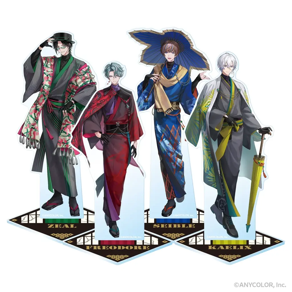 アクリルスタンドはZeal Ginjoka、Freodore、Seible、Kaelix Debonairの各1種が用意されています。素材はアクリル樹脂で、日本製です。