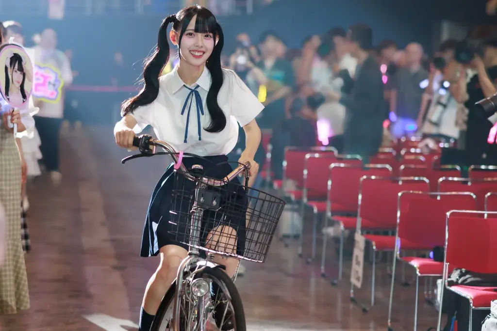 開演はメンバーの松本ももなと東山恵里沙による影ナレで告げられ、overtureの前にロックなトラックが流れるという異例の構成からスタートしました。メンバーは客席通路から自転車で登場し、観客との距離を極めて近い形でステージに集合。スタンド席からアリーナまで一斉に盛り上がる演出が行われました。