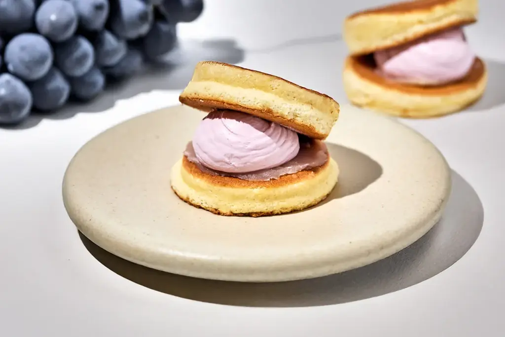 同じく本みりんを贅沢に使用したしっとりとした生地に、巨峰の果汁を合わせたクリームと巨峰とブルーベリーのゼリーを挟んだ生どら焼きです。果実の酸味と甘みのバランスを重視しています。