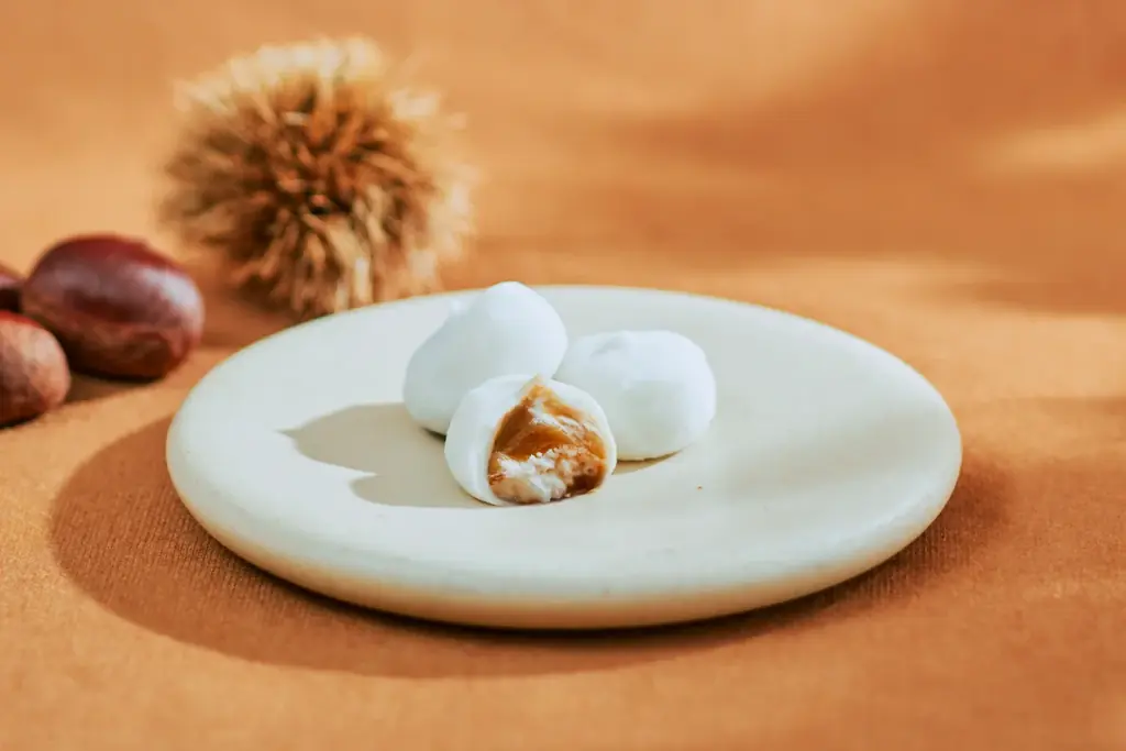 しっとりとした口溶けの柔らかな求肥の中に、小布施の深い味わいの和栗餡を合わせた秋限定の大福です。口の中でほどける上品な味わいを重視しています。