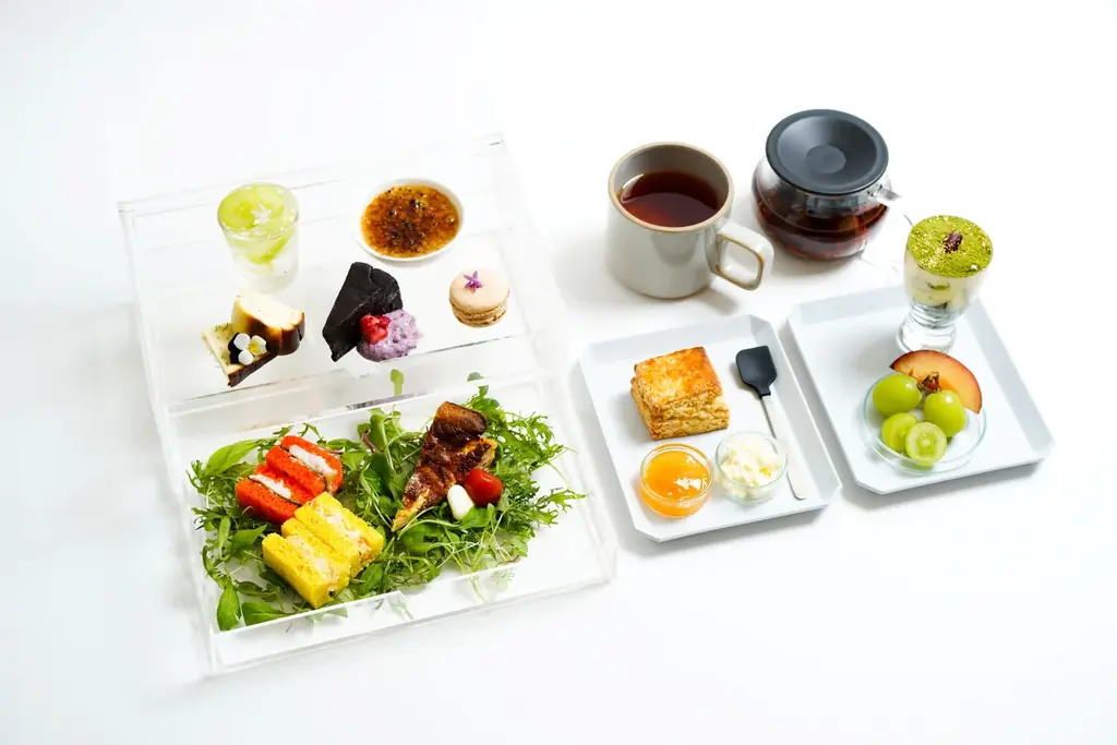 アフタヌーンティーのフードは和洋の素材を取り混ぜ、ビーガン対応スイーツも含めた多様なラインナップです。季節のフルーツや抹茶、酒粕など日本らしい素材も用いられています。