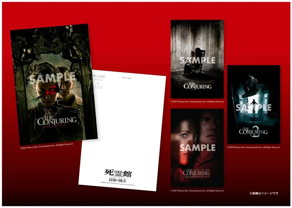 来場者特典 | ① 過去シリーズオリジナルポスター使用ポストカード(鑑賞作品に対応)②『死霊館 最後の儀式』オリジナルポストカード・オリジナルステッカー(過去作鑑賞者全員) |