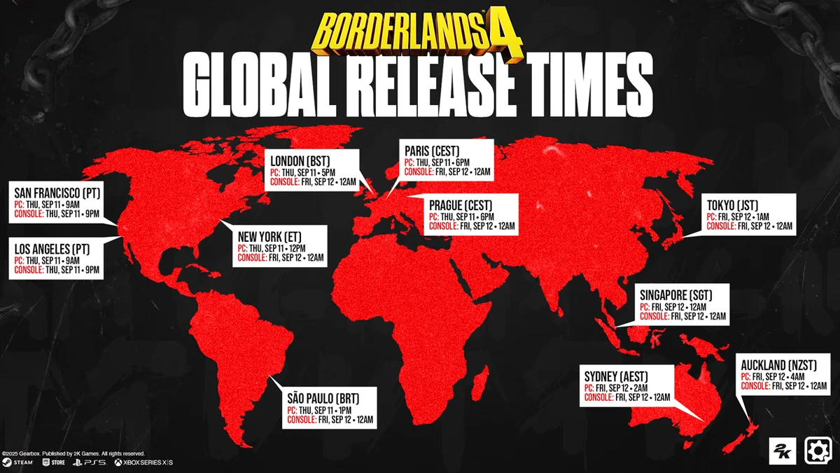 『ボーダーランズ4』は、まずPlayStation®5、Xbox Series X|S、PC(SteamおよびEpic Games Store)での同時発売が行われ、その後Nintendo Switch™2向けに発売されます。以下は各プラットフォームごとの地域別発売日時の一覧です。表で確認しやすく整理しています。