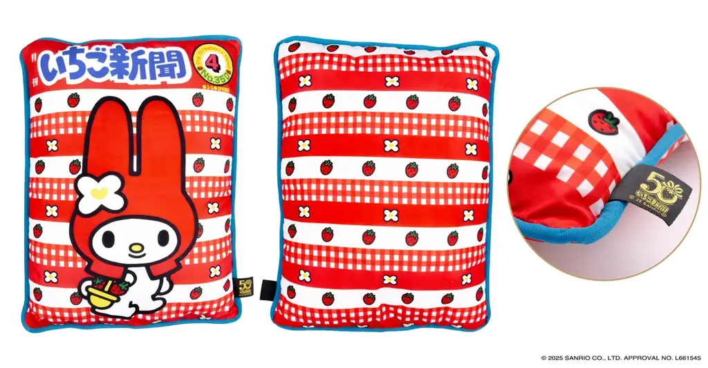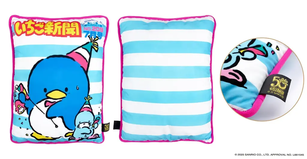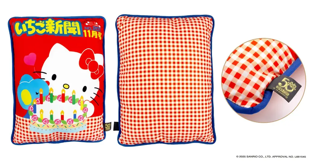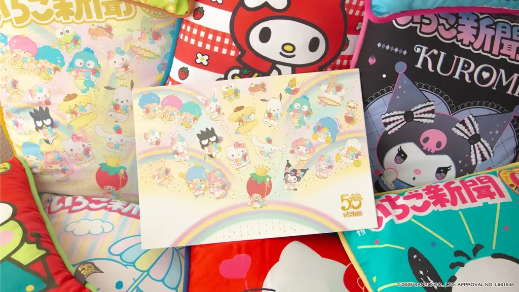 サンリオの機関誌「月刊いちご新聞」の創刊50周年を記念して、フタバ株式会社が企画した『いちご新聞50周年 フレーム切手コレクション』が発表されました。商品は「フレーム切手」と「クッション」がセットになった完全受注生産の商品で、受注は2025年10月1日(水)午前0時15分から「郵便局のネットショップ」で開始されます。