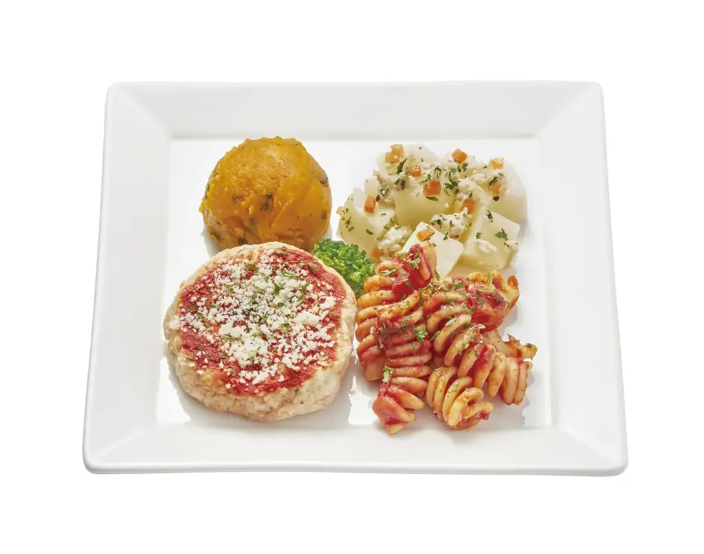 内容:鶏肉ピザ生地のミニチキンピザ、トマトパスタ、チキン&ポテト、かぼちゃデザート。冷凍で提供。数量限定。 - コミフ やさしいスイーツXmasケーキセット