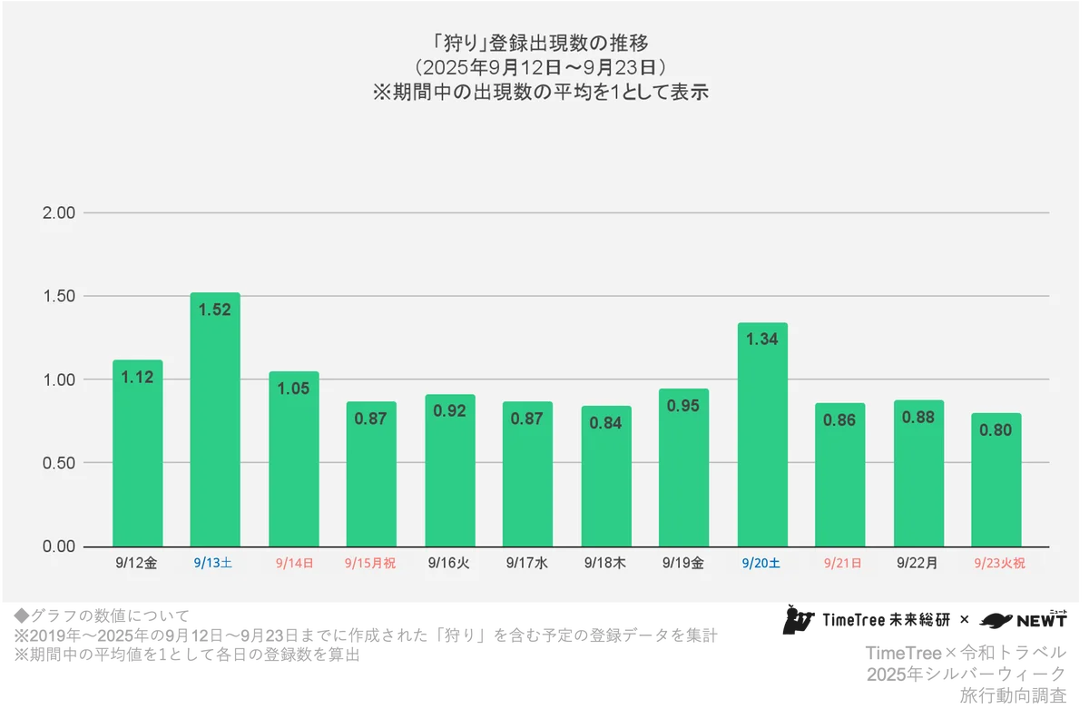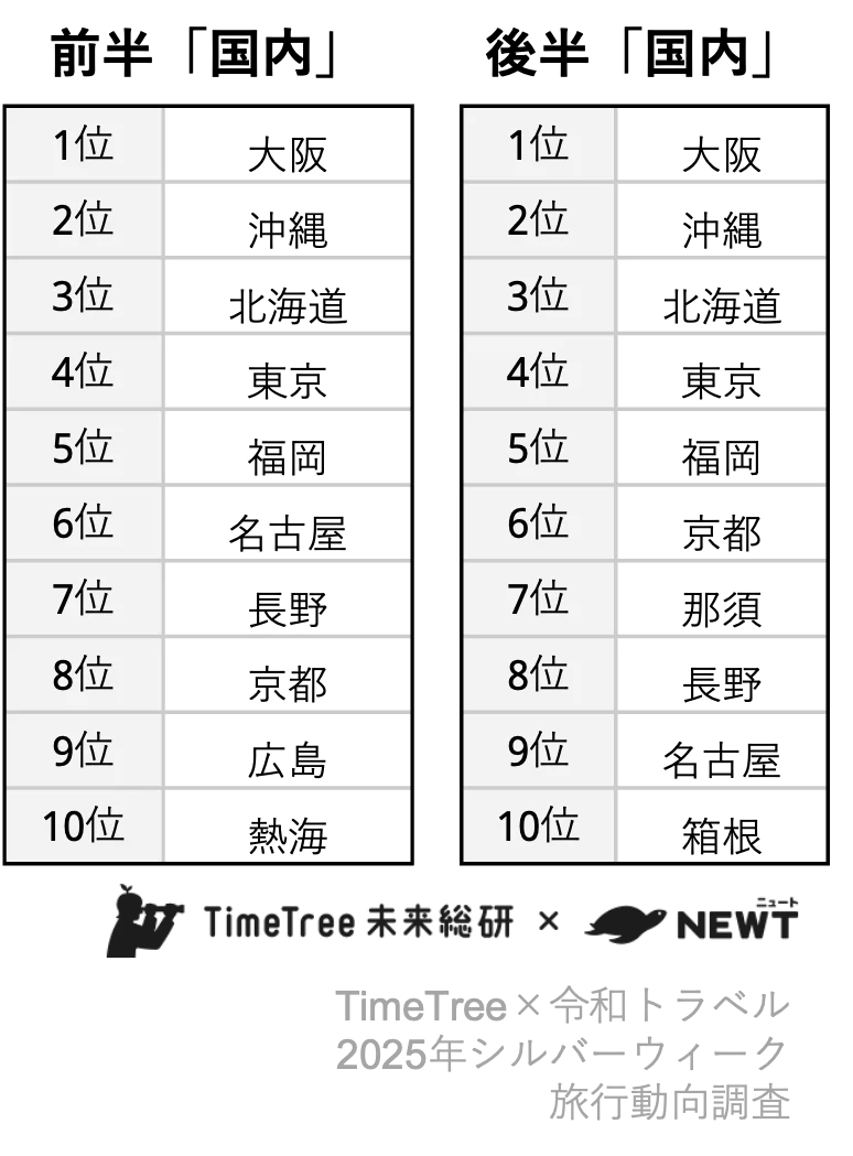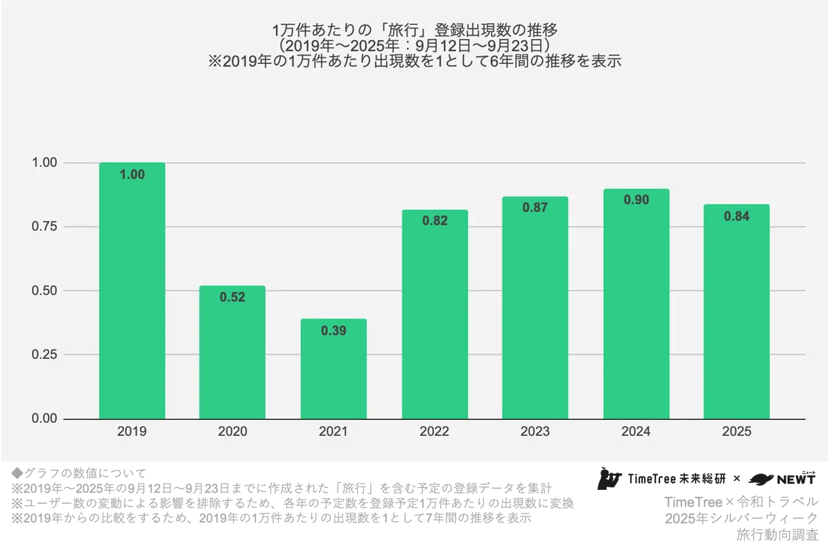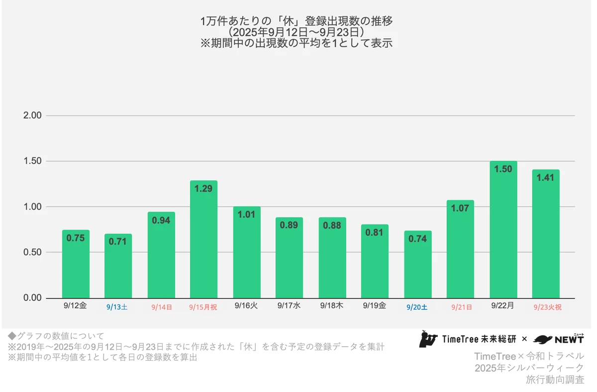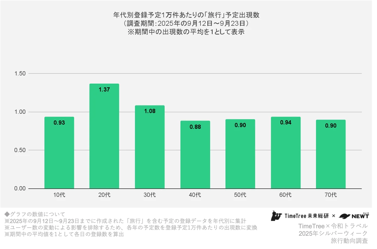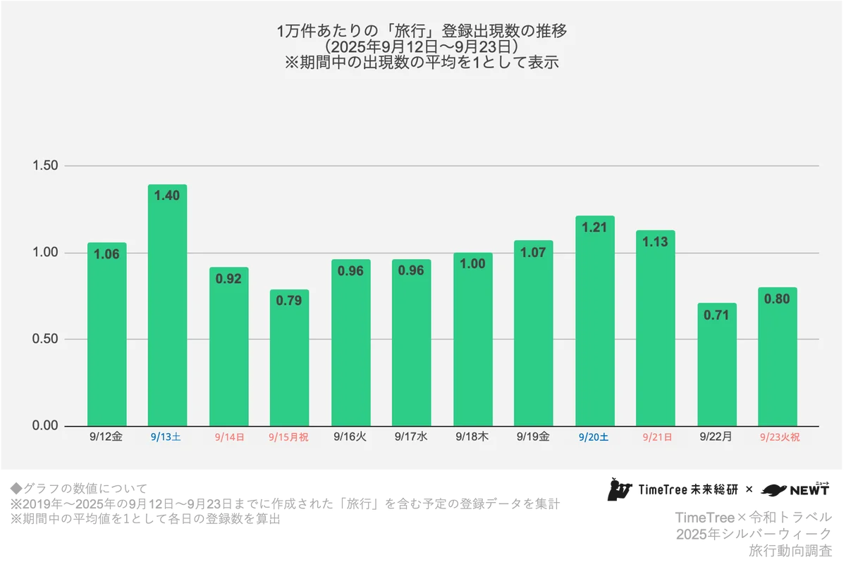 株式会社TimeTreeの社内研究所であるTimeTree未来総合研究所と、株式会社令和トラベルが運営する旅行アプリNEWT(ニュート)が共同で分析した結果、2025年のシルバーウィーク(2025年9月12日〜23日)に関する旅行動向が明らかになりました。TimeTreeはカレンダーに登録された「旅行」を含む予定データを解析し、NEWTは同アプリ内の予約データを解析しています。