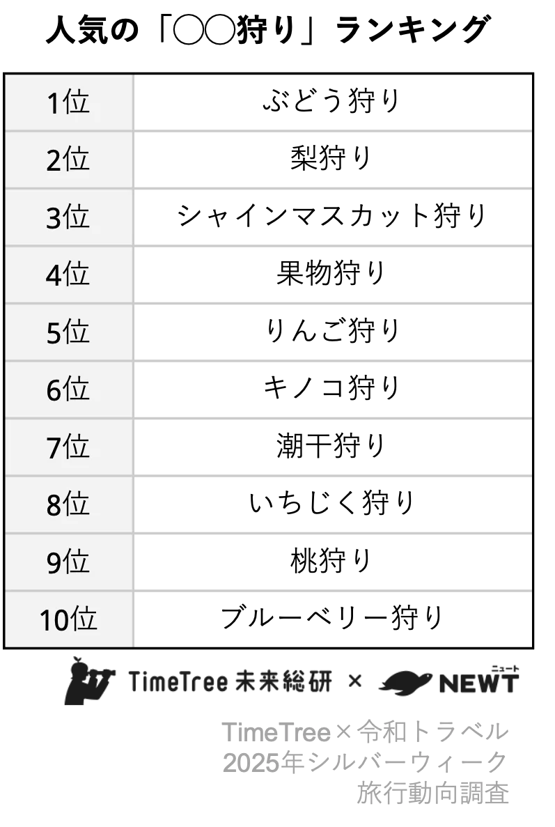 - 9月は「ぶどう狩り」の予定登録が急上昇し、梨狩り、シャインマスカット狩りなども上位に入りました。予定データ上位300件を確認すると、果物狩りが多くランクインし、キノコ狩りや潮干狩りも存在しました。シルバーウィークならではの“食欲の秋”に直結する体験需要が高まっています。