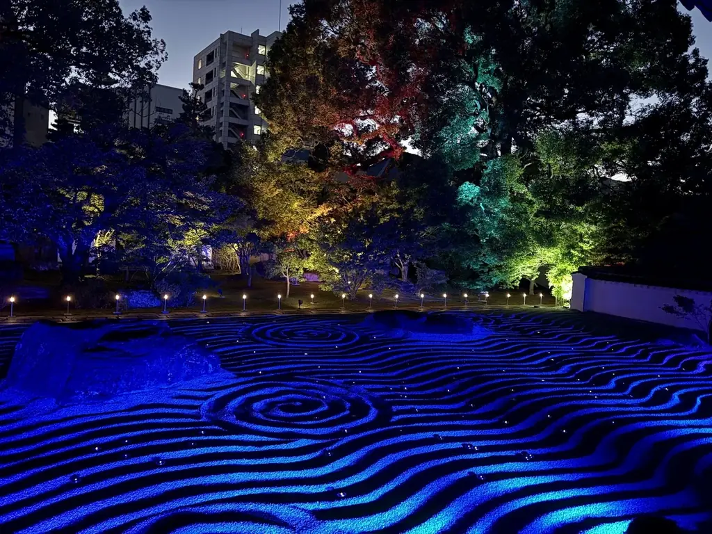 「博多旧市街ライトアップウォーク2025 千年煌夜」は、福岡市博多区の歴史ある寺社や庭園を夜間に特別公開し、幻想的なライトアップで照らす毎年恒例のイベントである。普段は見られない寺社の夜の姿や庭園のライトアップ、夜市やジャズ演奏など、多彩なコンテンツが用意されており、例年多くの来場者を集める秋の風物詩となっている。