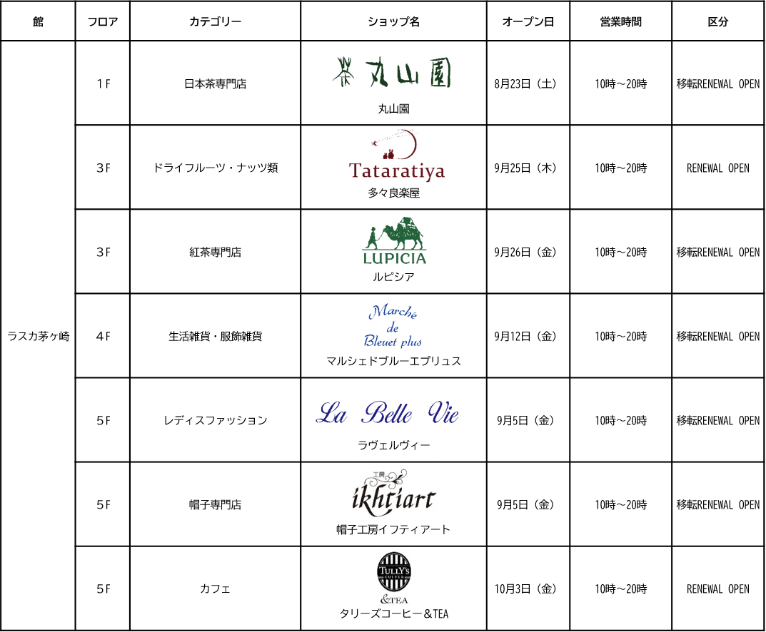 既存店舗の移転や業態変更を含むリニューアルオープンは、8月下旬から10月上旬にかけて行われます。各店舗の移転日や業態の趣旨、主な取扱商品について順に示します。