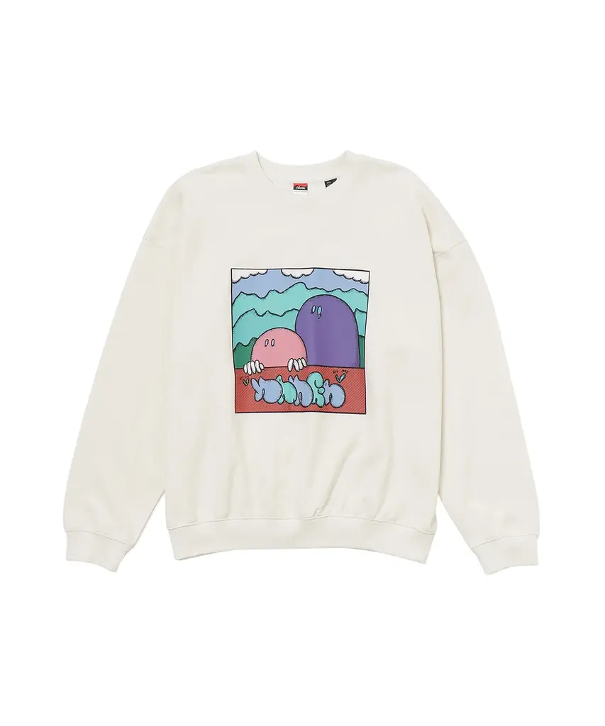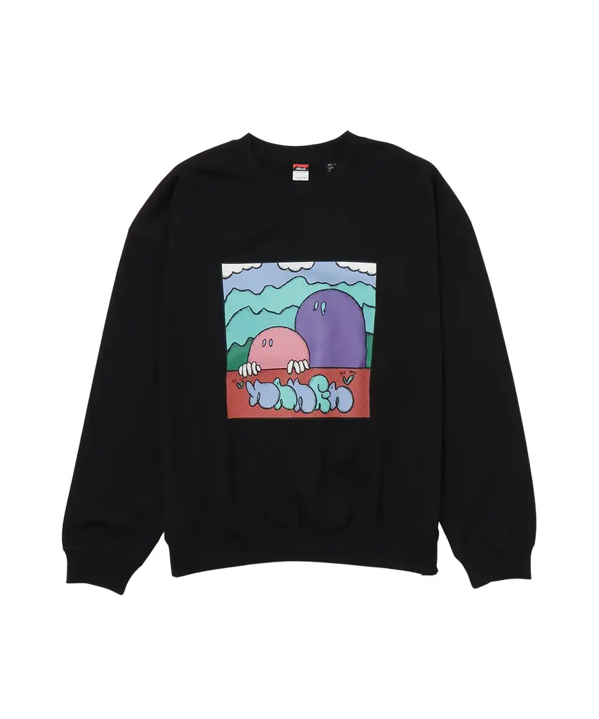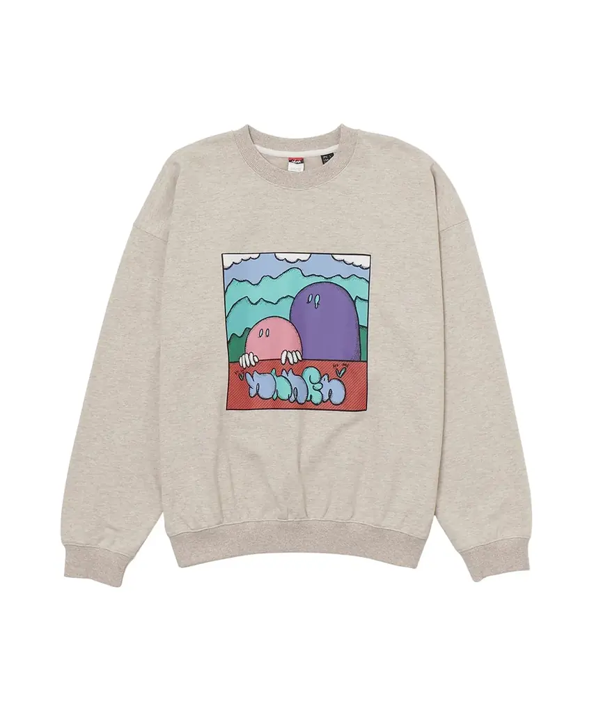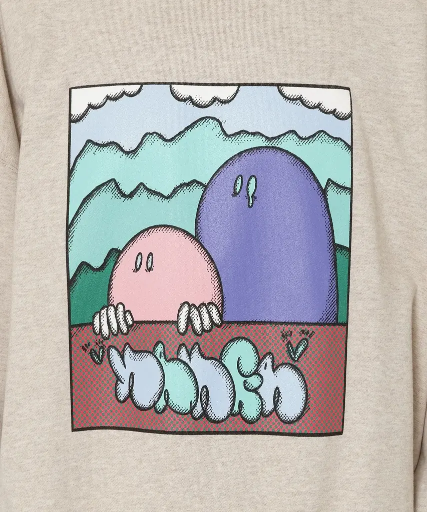 スウェットには神山氏のキャラクター「RATFACE」をフィーチャーし、作品名は「RATFACE in Mountain」。山を舞台に仲間たちのやり取りをユーモラスに描いたアートワークがフロントに配されています。二人の旅をストーリー仕立てで表現し、アウトドアでの好奇心や遊び心を感じさせるデザインです。