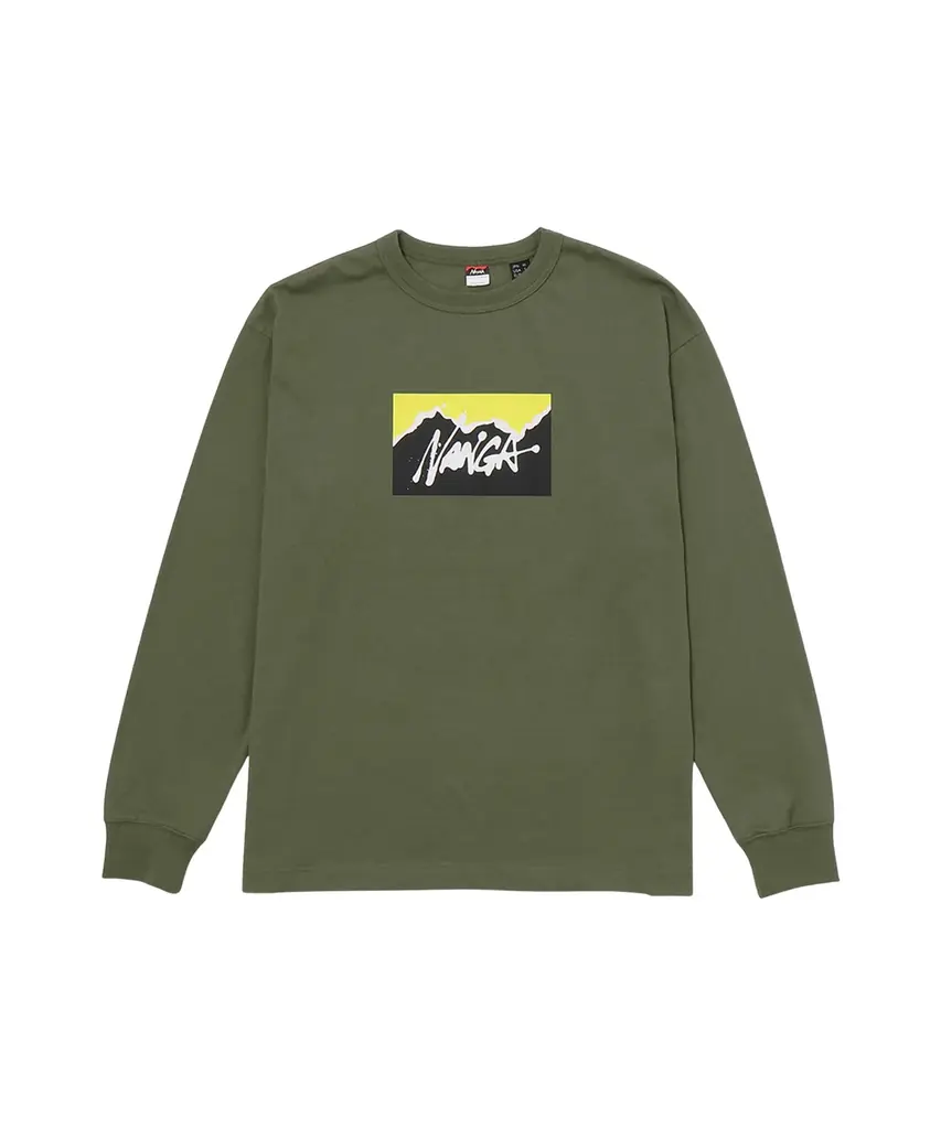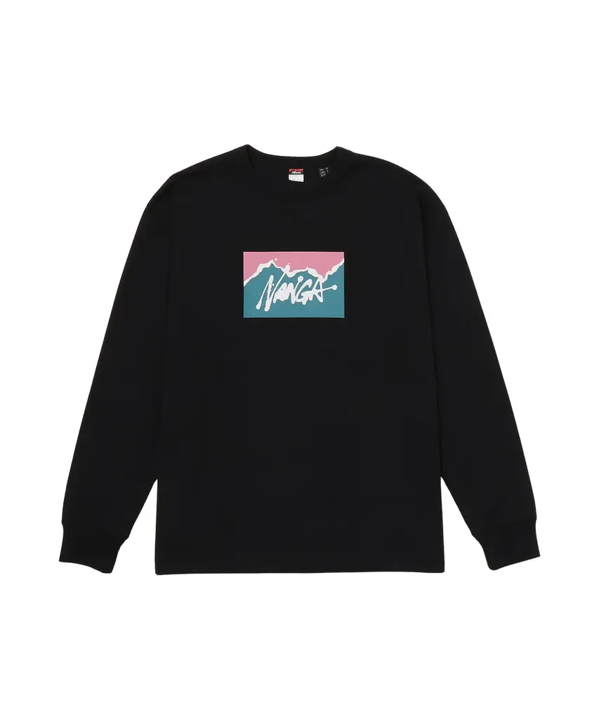 ロングスリーブTシャツは、NANGAの象徴であるボックスロゴをベースに、神山氏がアレンジを加えた特別なグラフィックを配置しています。ナンガ・パルバットの稜線とブランド名を、スプレーで描いたような躍動感あるタッチで表現し、手描きならではの存在感を持たせています。