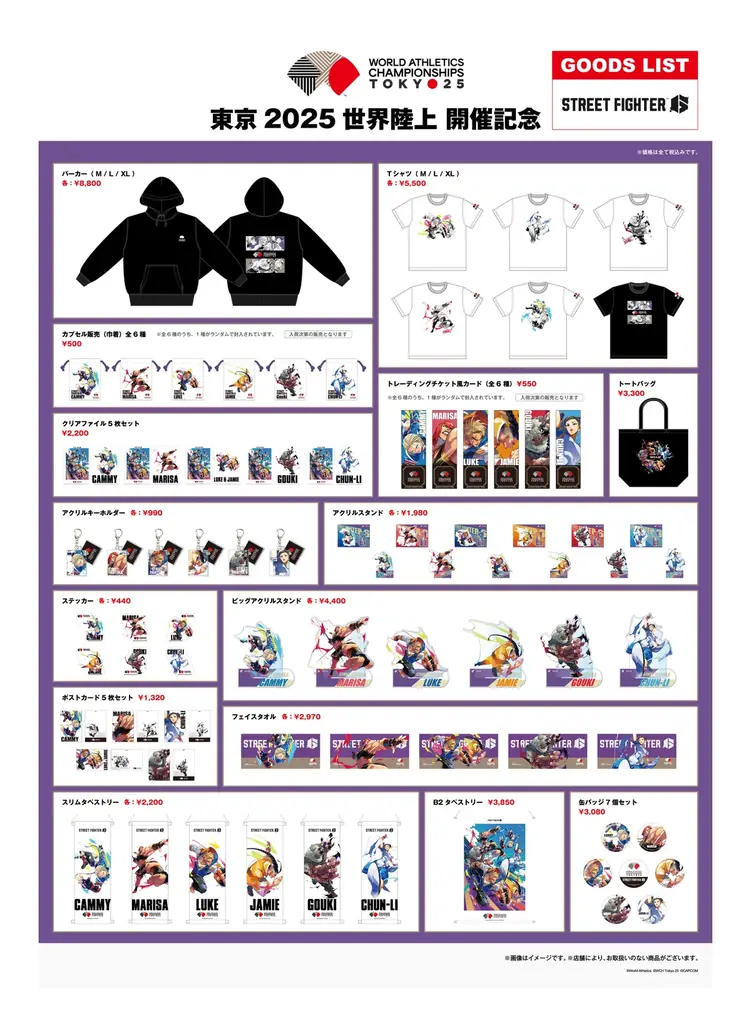 株式会社TBSグロウディアは、2025年9月10日12時00分付の発表で、9月13日(土)から9月21日(日)に開催される「東京2025 世界陸上」を記念したコラボレーション企画の第三弾として、対戦型格闘ゲームの金字塔である『ストリートファイター6』(以下、ストリートファイター6)とのコラボレーション商品を発表しました。今回の発表は、先に発表されたTVアニメ『進撃の巨人』や「サンリオキャラクターズ」とのコラボに続く取り組みです。