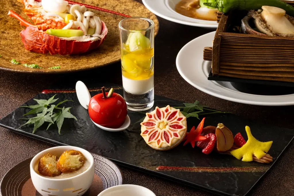 コースは前菜から始まり、海産物や肉料理、そして締めの炒飯とスープ、最後にパティシエール特製デザートで構成される。一品一品に季節感を取り入れており、秋の風情を表現した素材と調理がポイントとなっている。