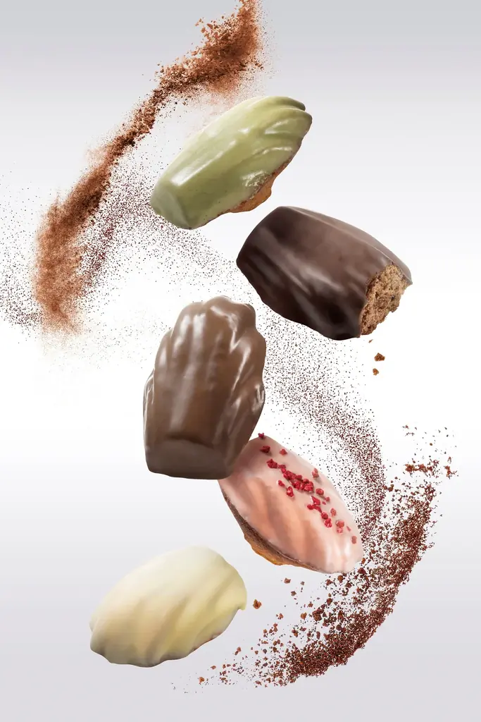 マドレーヌは、ショコラティエが生地に直接プラリネやカカオ、フルーツピューレなどを練り込み、焼成後にチョコレートでコーティングして仕上げるラインです。ひとつずつ丁寧に手作りされ、しっとりとした食感とチョコレートのコーティングが特徴です。