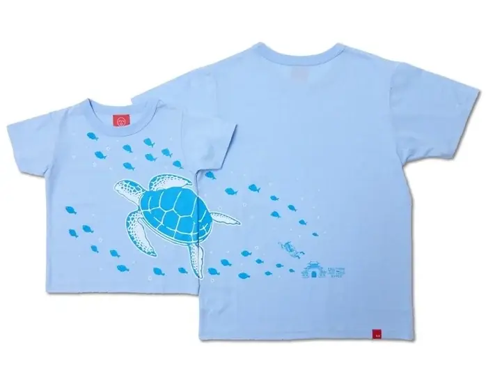 ウミガメを中心に配したモチーフは、海の生きものとしての親和性と海洋環境の象徴性を兼ね備えている。アイスブルーは清浄な海を想起させる色調として選ばれ、普段着としての使いやすさと視覚的なインパクトのバランスが考慮されている。