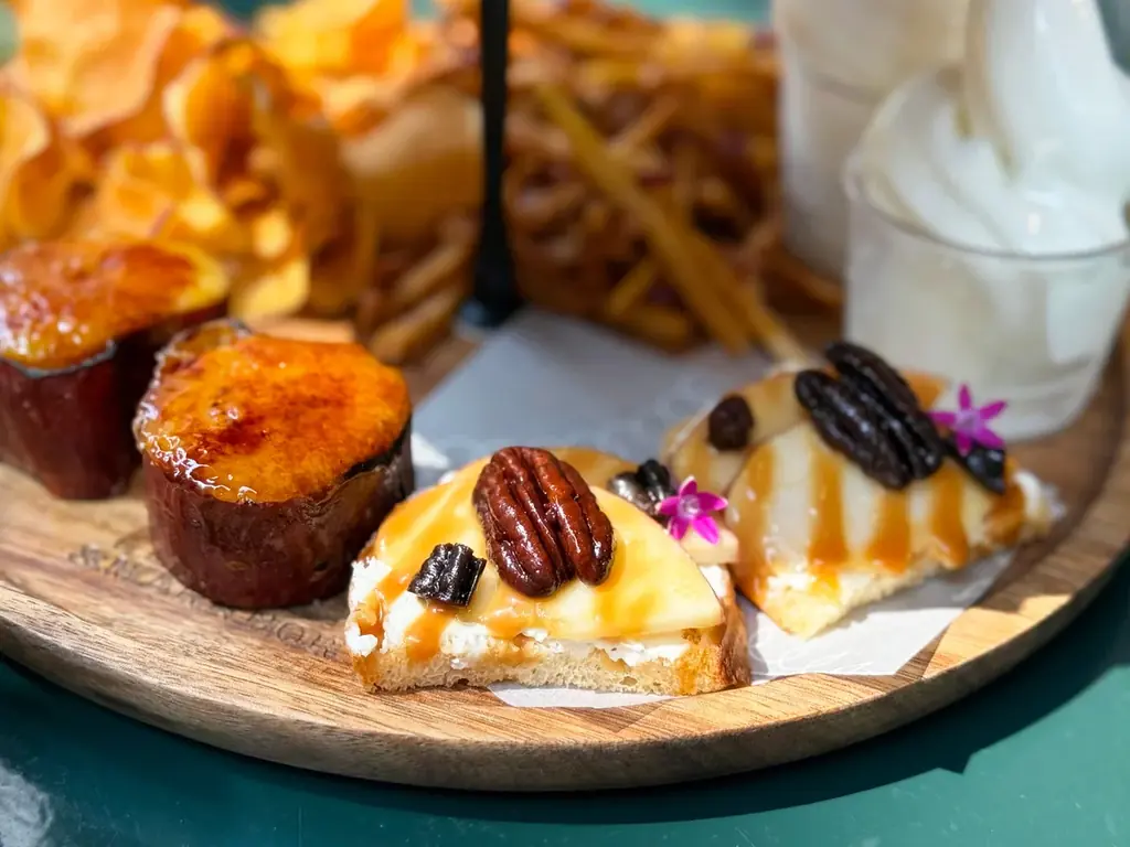 りんごとピーカンナッツのカナッペは、爽やかな酸味を持つりんごとピーカンナッツの組み合わせが特徴です。おからのガトーショコラは有機チョコレートを贅沢に用い、おから(国産大豆由来)で仕上げたグルテンフリーの一品です。季節のフルーツはその都度変わり、旬を生かしたトッピングが施されます。