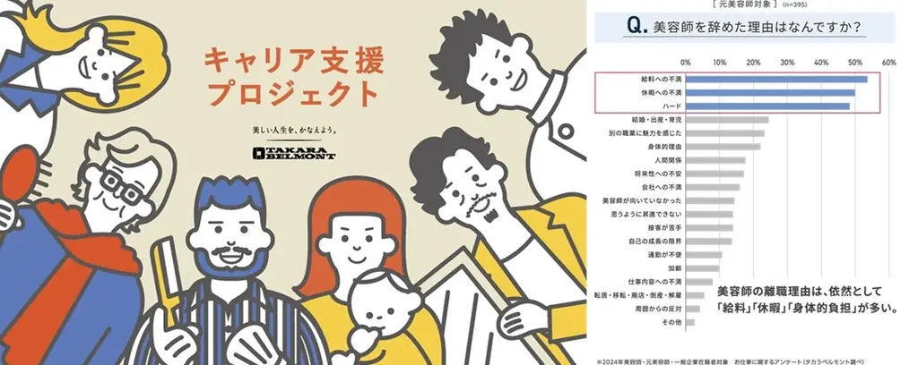 今回の「キャリア設計支援」は、タカラベルモントが2024年に始動したキャリア支援プロジェクトの第2弾に位置付けられる。プロジェクト全体は理美容師が業界内で長く輝ける環境づくりを目的としており、環境改善や学習支援の開発など幅広い領域で活動している。