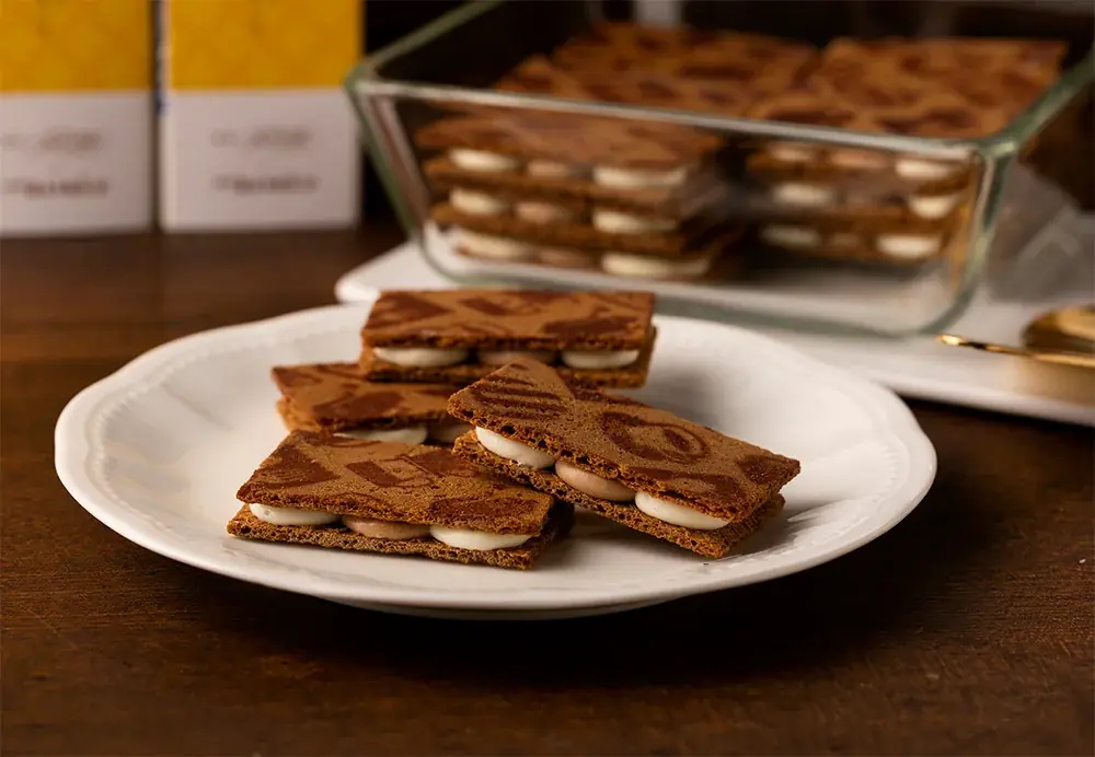 エチオピア産コーヒー豆由来のやさしい味わいの「コーヒーショコラ」と、欧州産マスカルポーネチーズを練り込んだ「マスカルポーネショコラ」の2種を、ザクザクの薄焼きクッキーで挟んだ商品です。口の中でティラミスの風味がほどける仕立てになっています。