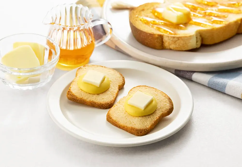 ハチミツをとろりとかけ、バターをのせた“焼きたてトースト”を模した見た目が特徴のサブレです。パンの耳まで再現したトースト型のサブレにまろやかなハチミツショコラを乗せ、さらにバターショコラをトッピングしています。