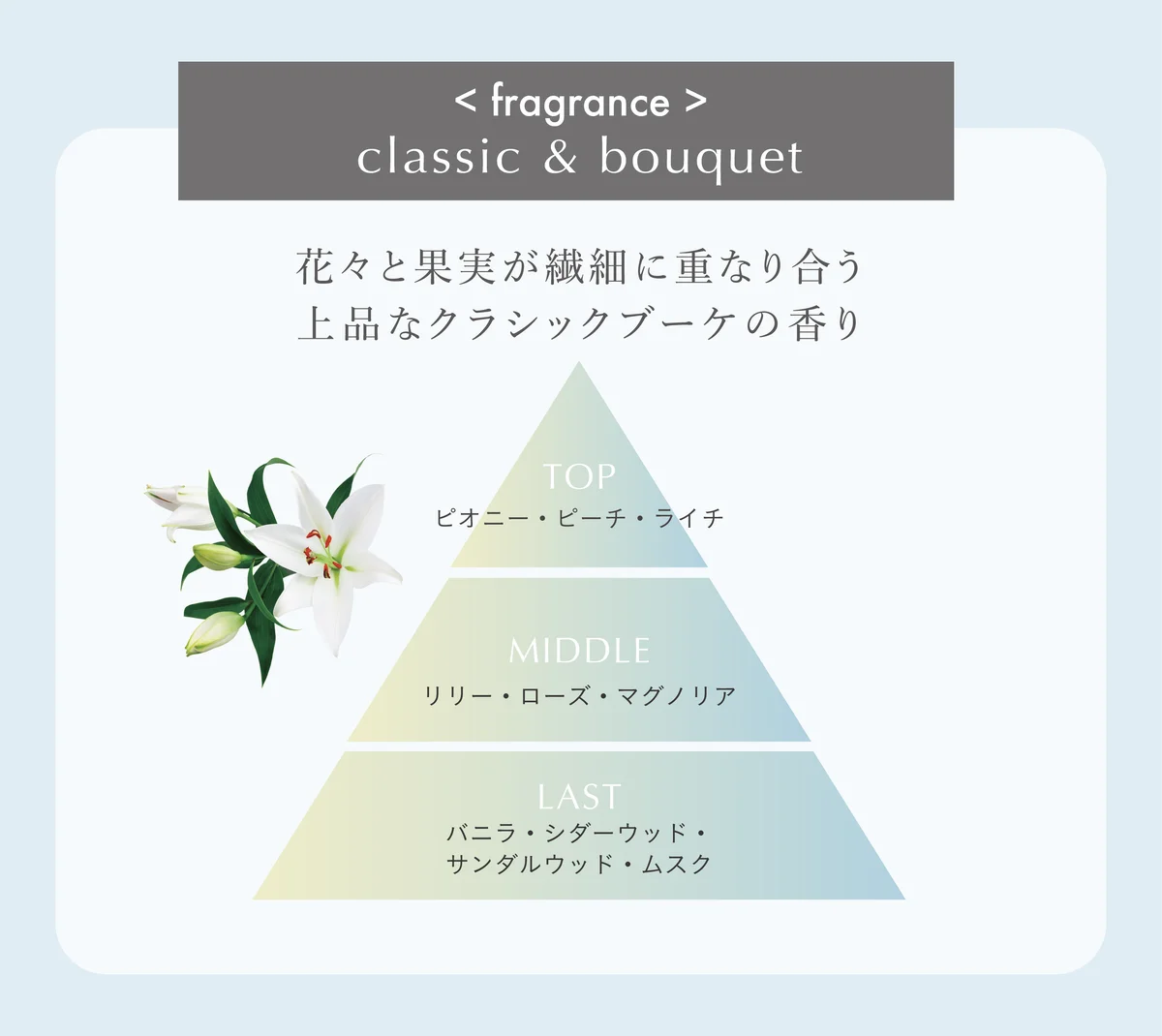 香調に関しては上品で清潔感のあるクラシックブーケの香りと明記されており、日常使いの中で強すぎない香り立ちを重視したバランスとなっています。