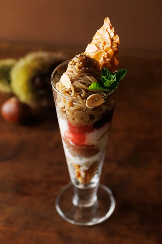 - 和栗のモンブランパフェ:1,320円(税込) — 和栗とジャージー牛のミルクを合わせ、ガナッシュ、パウンドケーキ、生クリーム、ナッツ、いちご、ブルーベリーをバランス良く重ねたパフェ。