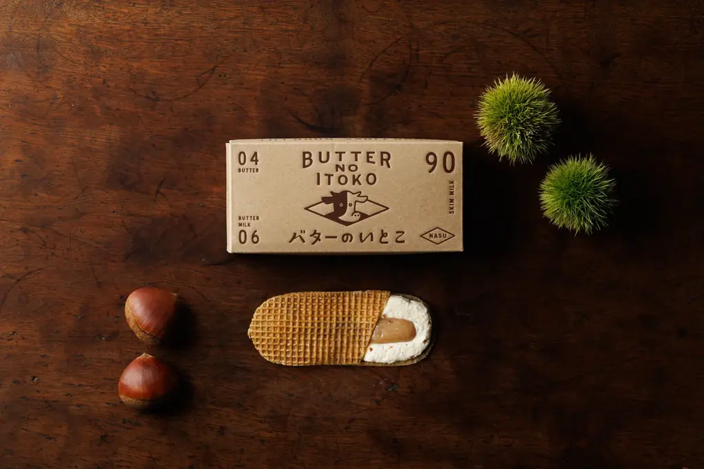 - 栗アイスサンド:935円(税込) — スキムミルクベースのコクあるアイスを、ほうじ茶風味の「いとこ」の皮でサンドし、アイス中にマロンジャムを配した那須限定品。