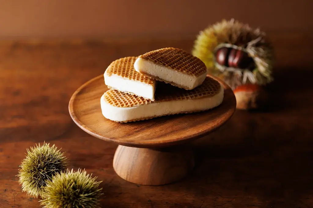 北海道向けには別仕様の「北海道バターのいとこ 栗」も同日より販売されます。こちらは白い黄身の卵を使用した白いゴーフレット生地が特徴で、ふんわりとミルキーな栗味を目指した設計です。価格は同じく1,080円(税込)です。