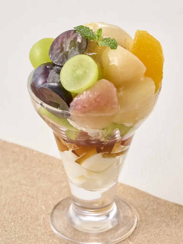 主な素材 | 豆乳アイス、豆乳入りホイップ、白桃、2種のぶどう、白桃ももの酢ジュレ、もっちり嶺岡、ほうじ茶ゼリー |