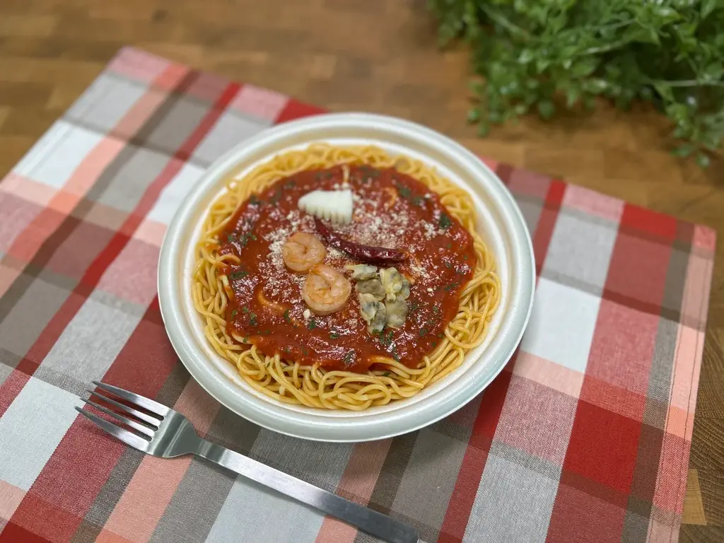 - 海老、あさり、いかを使用。トマトベースのピリ辛ソース、プリッとした麺の食感