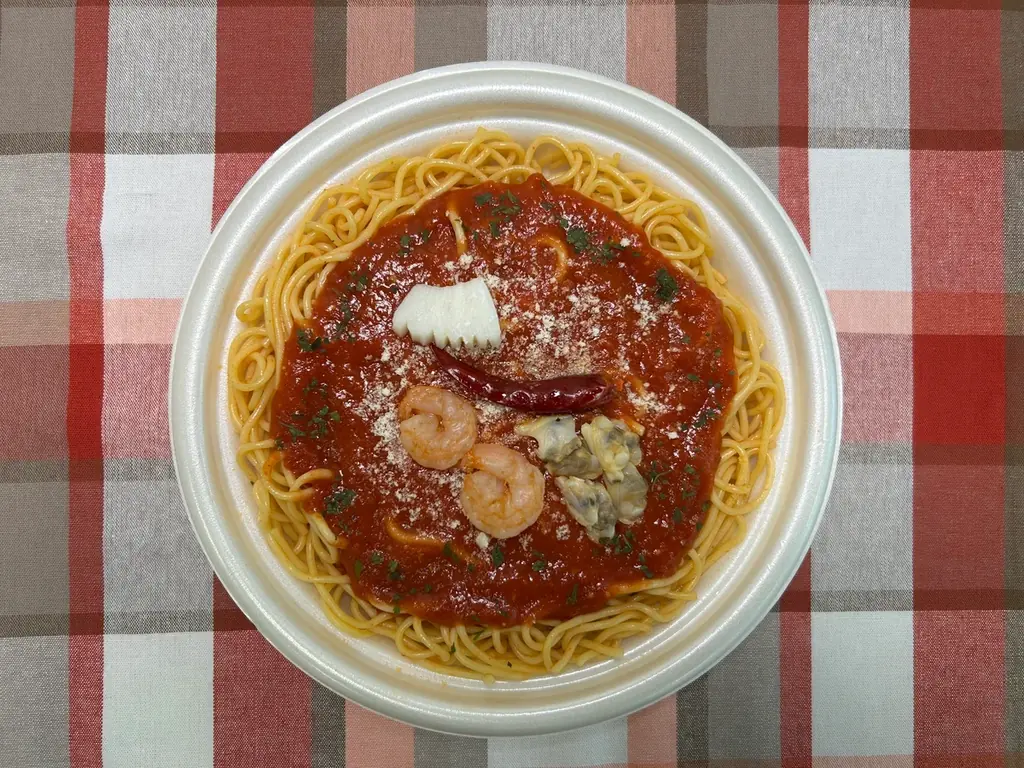 商品特長 | トマトベースのピリ辛ソースに海老、あさり、いかなどの魚介を使用。プリッとした麺の食感 |